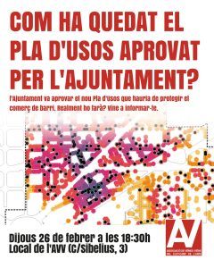 Quan l’any 2017 es va comprovar que el Pla d’Usos aprovat l’any 2016 (sense la nostra participació) era un desastre que permetia que els negocis de degustació i similars (falsos forns, bars encoberts, més terrasses) anessin saturant i massificant algunes parts dels nostres carrers, l’AVV va reclamar de fer-ne un de nou que fos restrictiu de veritat amb les activitats problemàtiques i amb les massificacions. Al Districte se’ns va dir que es faria l’any 2018 però això es va incomplir aquell any, el següent, el següent, durant la pandèmia… L’AVV continuava insistint que es fes, però no ha estat fins a finals del 2025 que s’ha aprovat el nou Pla d’Usos.